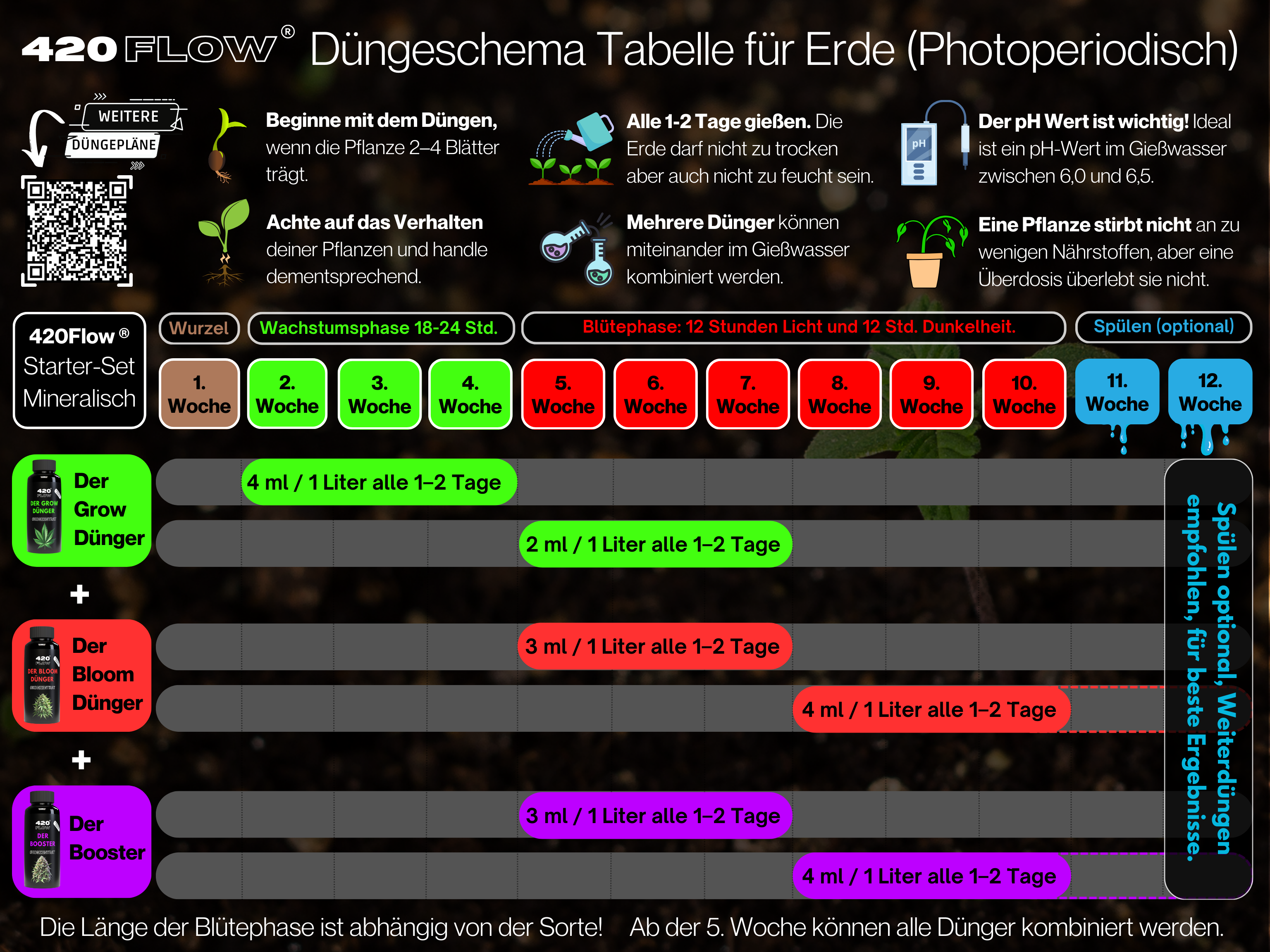 Photoperiodische Pflanzen reagieren auf den Lichtzyklus. Beginne bei 2–4 Blättern mit Grow Dünger, kombiniere ab der Blüte Grow, Bloom und Booster. Halte den pH-Wert bei 6,0–6,5. Spülen bei Bedarf möglich.