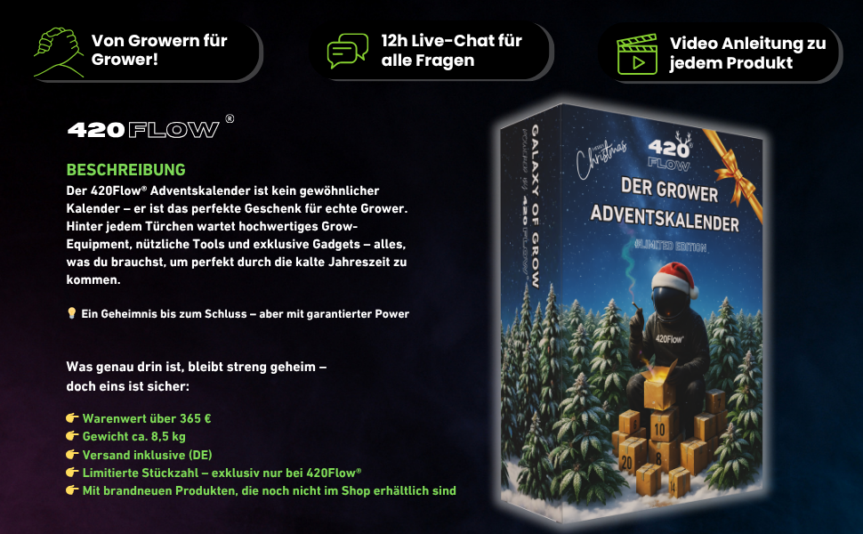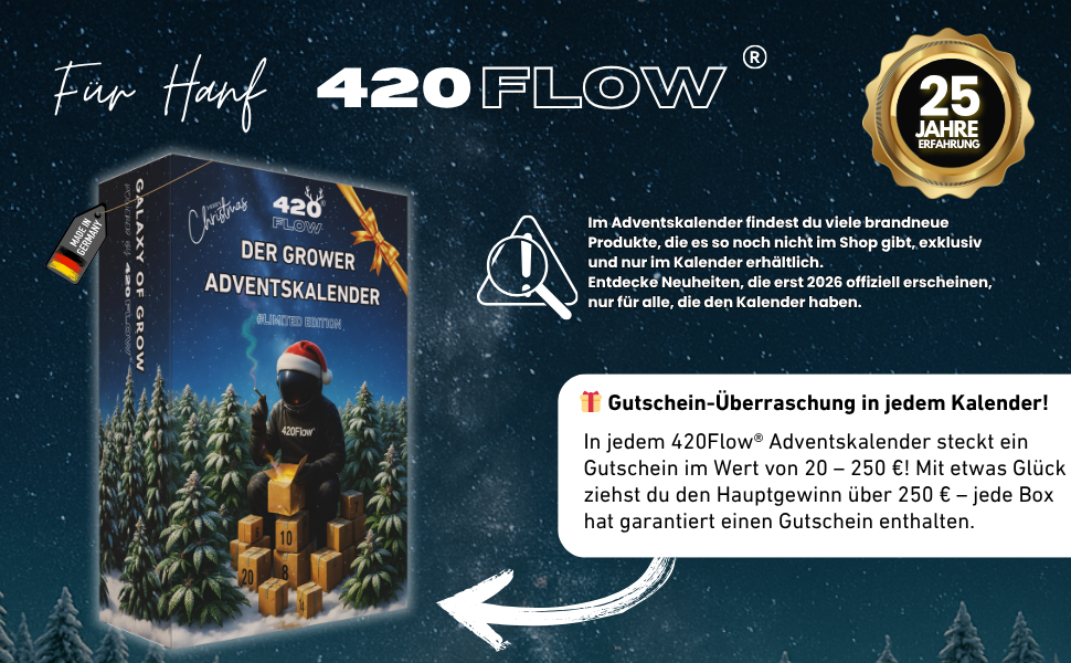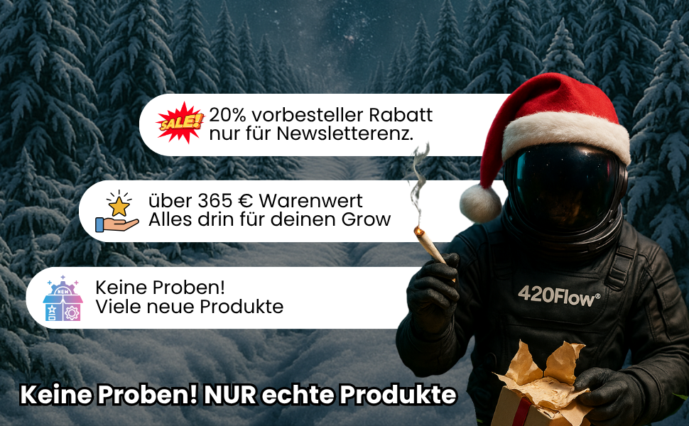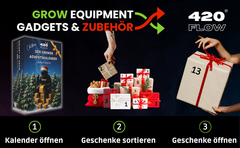 Der 420Flow® Adventskalender ist kein gewöhnlicher Kalender – er ist das perfekte Geschenk für echte Grower. Hinter jedem Türchen wartet hochwertiges Grow-Equipment, nützliche Tools und exklusive Gadgets – alles, was du brauchst, um perfekt durch die kalte Jahreszeit zu kommen.