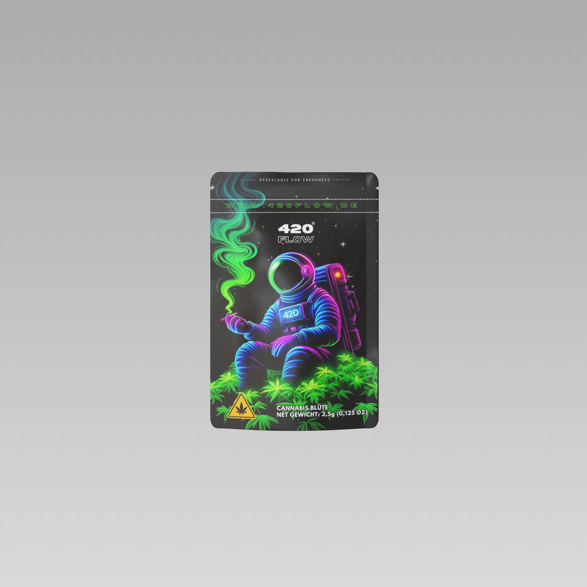 Der Smoking Astronaut Baggy kombiniert auffälliges Design mit praktischer Funktion. Das leuchtende Astronauten-Motiv im Neon-Stil macht ihn zum Hingucker – und bewahrt dein Weed gleichzeitig sicher, frisch und aromatisch auf.